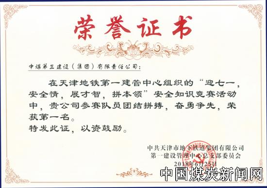 | 中煤三建市政工程公司天津地铁4号线8标项目部荣获天津地铁安全知识竞赛活动第一名 | |||
