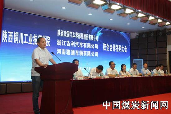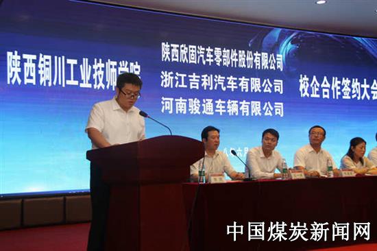【本网讯】6月6日,陕西铜川工业技师学院校企合作签约仪式在学院五楼多功能会议厅隆重举行。陕西欣固汽车零配件股份有限公司总经理由胜田、河南骏通车辆有限公司副总副经理于世明、浙江吉利控股集团人力资源中心高级经理牛泽平、浙江吉利控股集团西北大区经理王一洲、浙江吉利控股集团校企合作陕西区域经理李智勇、陕西铜川工业技师学院院长张晓彻、副院长张鹏、铜川市就业局培训科科长陈肖等领导和来宾出席了签约仪式。全院教职员工及学生五百余名参加了签约仪式,签约仪式由副院长张鹏主持。