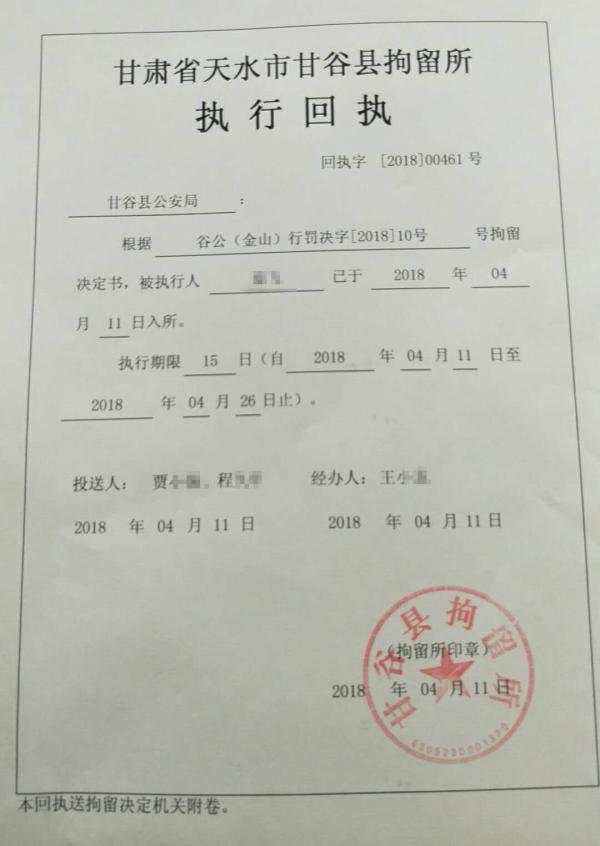 煤炭经营户运煤车被砸3月25日晚上11时许,运煤司机杨治琪开车进入甘谷县境内时,路边几个身作便装的人向他招手,由于不清楚对方身份,他没停车,直接开过去了。当他行至甘谷金三乡时,后面追上来一辆小车,下来四个人,见了他的车,操起砖头就砸 。 “我当时刚下车上厕所出来,看到这情况转身就跑了。”杨治琪说,等到这些人离开,他才回到车上,车前灯、挡风玻璃和左右车窗玻璃都被砸了。 他给煤炭买主杨宝太打电话,杨宝太让他赶快报警。次日上午,警察到现场取证,并将他带到金山派出所做了笔录。从派出所出来,甘谷县的朋友告诉他,砸车的人开的车找到了,这辆车正在路上拦截其他运煤车辆,他将这一情况转告了警方。然后开着货车将该车拦在路边,等警方来取证。这辆车准备离开,又同他的货车发生刮擦,一会来了一二十个人,围着他,要求赔偿10万元。杨治琪坚持报警,报保险。交警来了之后,让他离开了。 他将车开往修理厂,前后花费5000多元。大概10多天后,甘谷警方给他打电话,说砸车的人被处理了,并发来了对砸车人行政拘留的处罚决定、行政拘留执行回执单。 ![]() 甘谷警方对打砸运煤车的“煤炭督查”人员行政拘留的处罚决定书。 甘谷县煤炭经营户 提供