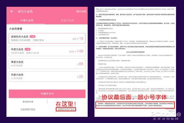 然而被这些套路套路后,我们可能还很难和服务提供商理论。人家有说明,也并非强制,字号小点,色彩淡点,要怪只能怪用户太粗心咯。要投诉要退款?不好意思,人家有一份超小号字体的「连续包月用户协议」,协议中明确表示:扣除的费用不予以退还,由用户自行承担相关责任。