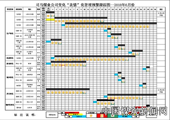【本网讯】为了更好地开展变化调度管理方面的工作,及时、准确、全面地掌握矿井各主要环节的变化情况,强化变化条件下的措施跟踪和落实,促进安全生产工作。近日,山西潞安集团司马煤业公司创新工作方法,在原有的“变化管理跟踪落实台账”基础上增加了“变化管理预警跟踪图”,该图运用表情贴图的形式跟踪每项变化项目的进展情况。笑脸表情代表正常开展,哭脸表情代表未正常开展,剪刀手表情代表已完成,还用红黄蓝三色对预警级别和跟班级别进行了标识,生动形象的展示了每项工作的安全级别和进展情况。
