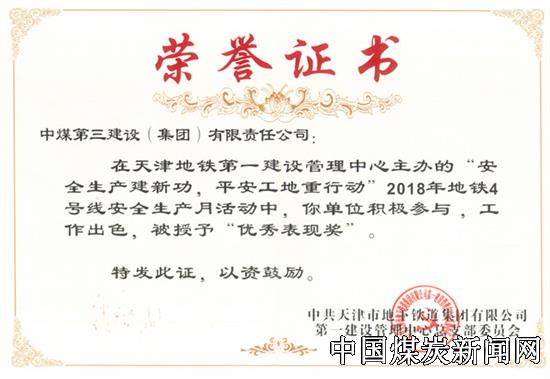 | 中煤三建市政工程公司天津地铁4号线8标项目部荣获天津地铁安全生产月活动“优秀表现”奖 | |||