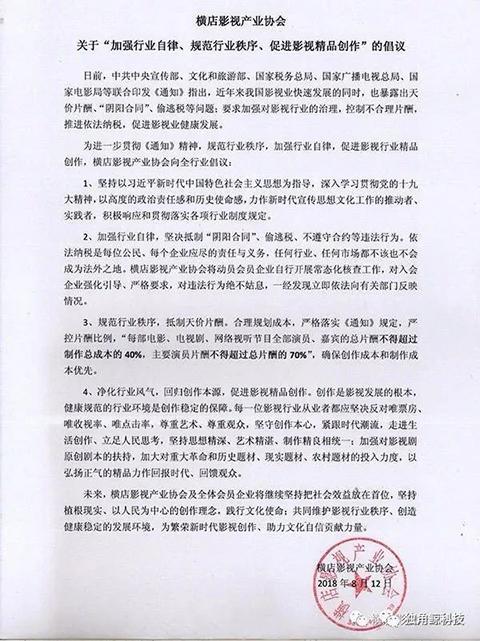 抵制天价片酬阵营进一步壮大:8月12日,北京、横店两地行业协会400余家影视公司加入抵制“天价片酬”、“阴阳合同”阵营 ,华谊兄弟、腾讯视频、爱奇艺等企业响应。 8月12日,为相应全行业遏制“天价片酬”、“阴阳合同”、偷逃税等问题,首都广播电视节目制作业协会、横店影视产业协会分别发表《关于加强行业自律遏制行业不正之风的倡议》和《关于“加强行业自律、规范行业秩序、促进影视精品创作”的倡议》。 8月11日,首都广播电视节目制作业协会9家会长单位:海润影视、大唐辉煌、华谊兄弟、爱奇艺、完美影视、北京电视艺术中心、酷云互动、磨铁集团、金英马影视,代表协会联合发表《关于加强行业自律遏制行业不正之风的倡议》。 8月12日,以华谊兄弟为会长单位,汇集了博纳影视、横店影视、乐视花儿影视、唐德影视、新丽传媒、印纪传媒、正午阳光等400余家影视企业的横店影视产业协会也发表了《关于“加强行业自律、规范行业秩序、促进影视精品创作”的倡议》。 两份《倡议》号召全行业一同遏制“天价片酬”、“阴阳合同”、偷逃税等问题,共同规范行业秩序,加强行业自律,促进影视行业创作精品化。其中最具有影响力的条款莫过于,“每部电影、电视剧、网络视听节目全部演员、嘉宾的总片酬不得超过制作总成本的40%,主要演员片酬不得超过总片酬的70%”。 华谊、华策、腾讯等多家响应 对于此次倡议,华谊兄弟回应新京报独角鲸科技(ID:dujiaojingkeji)称,作为上述两家协会的会长单位,会以身作则积极履行协会倡议。同时,华谊兄弟会继续坚持把社会效益放在首位,坚持植根现实、以人民为中心的创作理念,并携手所有协会会员共同维护影视行业秩序、创造健康稳定的发展环境。 腾讯视频对上述薪酬标准进行了详细解读:所谓单集100万,以一部30集的剧为例,演员可拿到的最高片酬为3000万。而总片酬最高不超过5000万是指,如果该剧的集数达到60集,演员拿到的最高片酬也只能为5000万,不再依据单集100万的单价进行计算,片酬实行封顶。特别要提出的是,片酬相应产生的税费由演员方承担。 腾讯视频还称,声明对外发布时间即为正式施行时间,发布时间之后签署的合同,三家视频网站和六大影视制作公司都将严格按照声明中提到的条款执行。“通过此次的倡议发声,我们希望全行业能联合起来,携手维护影视生态秩序,共同构筑规范、有序的制播环境,推动中国影视产业的良性健康发展。” 一接近华策影视内部人士则回应称,其一直重视和投入影视后备人才梯队的建设,积极承担社会责任,抵制高片酬现象。“我们专注于影视创作的本质,不断提升影视创作的流程化、系统化水平,并将有限的资金用在剧本、拍摄本身,用最低的成本、最高的效率,为观众提供最好的产品。”一位华策影视内部人士称。 此前(8月11日),爱奇艺、优酷、腾讯视频三家视频平台,正午阳光、华策影视、柠萌影业、慈文传媒、耀客传媒、新丽传媒六家影视制作公司联合发布关于抑制不合理片酬,抵制行业不正之风的联合声明。4月4日,腾讯、优酷、爱奇艺也曾联合发布《关于规范影视秩序及净化行业风气的倡议》。 声明中,多方共同抵制艺人“天价”片酬,抵制偷逃税,“阴阳合同”等违法行为。三家视频网站和六家影视制作公司采购或制作的所有影视剧,单个演员的单集片酬(含税)不得超过100万元,其总片酬(含税)最高不得超过5000万元。此外,上述多方还将共同抵制偷税漏税,“阴阳合同”等违法现象,承诺在影视剧制作、购销中加强自律,杜绝各种明目偷漏税,腐败现象的发生。三家视频网站连同六家制作公司,将协同建立黑名单机制,一经核实将停止一切合作,并依法向相关部门反映情况。 为何抵制天价片酬? 为何多家影视公司联合抵制“天价片酬”的,除了五部委《通知》精神的倡导外,是否还有产业核心痛点? 一位长期从事剧集制作超过五年的人士告诉新京报独角鲸科技(ID:dujiaojingkeji),影视剧的制作成本相对固定,如果核心演员的片酬过高,则会导致服装、化装、道具、后期等成本被压缩,影响剧集质量,国外甚至有不成文规定要求演员片酬不超过全部制作费用的30%、50%等等。同时,电视剧领域竞争激烈,如果不形成全产业倡议,由于利益的驱动,必然会有公司为流量破例,难以形成行业自治的合力。 对于,腾讯、优酷、爱奇艺等平台,虽然也独家制作剧集,但更多以合制、购买等形式获得剧集版权,上游制作公司的成本上升,必然推动购剧成本上升。以爱奇艺为例,今年一季度其内容采购和制作成本,达到39亿元,同比增长54%,在总成本中占比81%;今年二季度其内容采购和制作成本,达到47亿元,同比增长47%,在总成本中占比77%。 爱奇艺创始人兼CEO龚宇在8月初的二季度财报分析师会议上的发言,则很好的从播出平台的角度,解释了抵制“天价片酬”的原因。龚宇称:“在爱奇艺的成本中,内容成本是最大的,一项是剧、一项是综艺节目。综艺节目,广电总局在片酬方面已经给了一些指导意见,这些指导意见主要涉及演员片酬的限制并且已经开始在执行。电视剧方面,政府和我们都在思考和讨论过程中,还没有确定方案。几个月前,爱奇艺、腾讯视频、优酷已经发表了一个声明,这个声明更多的是倡导的意思没有约束性,未来可能会出台对演员片酬有约束性的公告。” 优酷