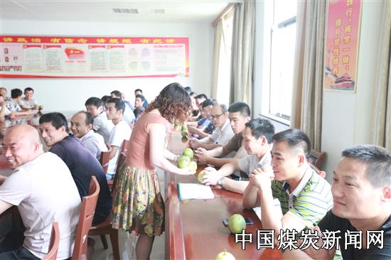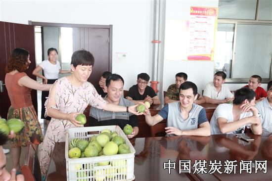 邱集煤矿由采煤塌陷区改造的湿地生态园种植的甜瓜和西瓜喜获丰收,该矿女工协管员兴高采烈地摘下职工自己种植的瓜果,送到区队班前会,首先让一线矿工兄弟品尝,让大家共同分享丰收的喜悦。