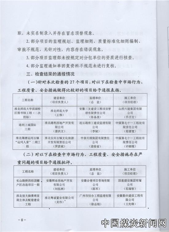 检查完成后,淮北市城乡建设委员会下发文件,对在市场行为、工程质量、安全措施等方面评分最高的3个项目给予了通报表扬。其中,中煤七十一处港利·上城国际三期工程和淮北隋唐运河古镇·运河人家二期工程脱颖而出,占据两个名额。另外,文件对淮北市建委还对检查中表现突出的优秀个人进行了通报表扬,中煤七十一处程晋宽和许晓锟榜上有名。