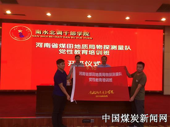 【本网讯】为进一步贯彻落实党的十九大精神,坚定理想信念,强化使命担当,9月10日至9月12日,豫煤物测队2018年第一期党员党性教育培训班在南水北调干部学院举办。全队党员干部共86人参加培训。南水北调干部学院教务科科长李富国致辞,并和队党委副书记、纪委书记、工会主席谷登宇一起为培训班授班旗。