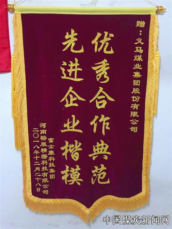 2019年1月11日,河南义煤公司人力资源部驻富士康劳务输出服务管理办公室收到一面红底金字的锦旗,上书“优秀合作典范,先进企业楷模”,锦旗由郑州富士康科技集团赠予,这是对义煤公司组织职工支援富士康生产工作的最佳褒奖,也是对到郑州富士康科技集团进行劳务输出义煤人的高度赞誉。