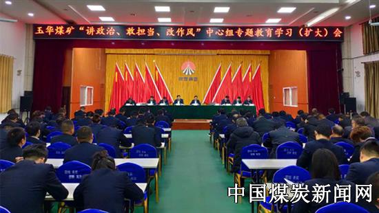 【本网讯】近日,陕煤铜川矿业玉华煤矿在职工文体活动中心召开“讲政治、敢担当、改作风”中心组专题教育学习(扩大)会。该矿副总以上领导、基层单位负责人及机关全体人员共计100余人参加了会议。