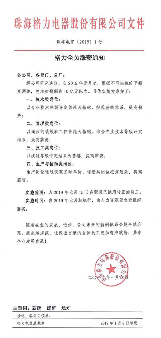 | 格力电器发布涨薪通知:人均加薪1000元 | |||