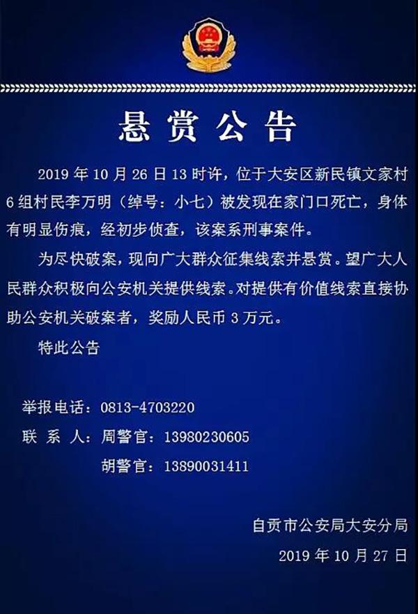 四川自贡市公安局大安分局微信公号“大安区公安”10月28日发布悬赏公告称,10月26日13时许,位于大安区新民镇文家村6组村民李万明(绰号:小七)被发现在家门口死亡,身体有明显伤痕。经初步侦查,该案系刑事案件。 为尽快破案,现向广大群众征集线索并悬赏,望广大人民群众积极向公安机关提供线索。对提供有价值线索直接协助公安机关破案者,奖励人民币3万元。举报电话:0813-4703220。联系人:周警官(13980230605)、胡警官(13890031411)。