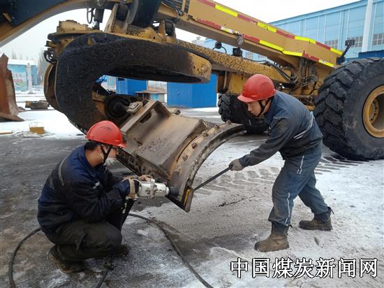 【本网讯】11月29日,准格尔旗薛家湾镇普降雪,为确保设备及时出动,准能集团设备维修中心及时启动冰雪天气应急预案,在确保安全的前提下,加紧抢修设备,为设备顺利及时出动提供保障。图为该中心工程机械车间检修一班班组成员正在雪天抢修更换10#24M平路机铲刀刀片。