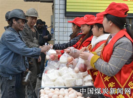 “师傅们,辛苦啦,来,来,来,领点小礼品暖暖胃!”在井口慰问现场,女工安全协管员热情地将一份份礼品递给刚出井的职工。