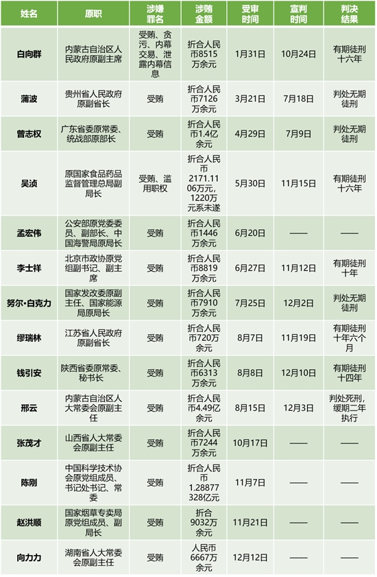 (今年以来受审的部分中管干部一览表,“——”表示暂未公布,表格统计截至12月23日) 据记者统计,今年以来,截至目前至少已有14名“老虎”走上“被告席”,9人已判刑(详细名单见上表)。其中内蒙古自治区人大常委会原副主任邢云被判处死刑,缓期二年执行,在其死刑缓期执行二年期满依法减为无期徒刑后,终身监禁,不得减刑、假释。 国家发改委原副主任、国家能源局原局长努尔·白克力,贵州省原副省长蒲波和广东省委原常委、统战部部长曾志权三人均被判处无期徒刑。 从涉嫌罪名上看,今年受审的“老虎”均涉及受贿罪。其中,涉贿金额最少的为江苏省原副省长缪瑞林,共计折合人民币720万余元;涉贿金额上亿的有三人,为中国科学技术协会原党组成员陈刚、曾志权和邢云,分别涉贿1.2亿余元、1.4亿余元及4.49亿余元。 此外,内蒙古自治区原副主席白向群和原国家食品药品监督管理总局副局长吴浈两人还涉及其他罪名。 2019年1月31日,辽宁省大连市中级人民法院一审公开开庭审理了白向群受贿、贪污、内幕交易、泄露内幕信息一案。“内幕交易罪”备受关注。 检察院起诉指控,白向群从相关股票内幕信息知情人员处非法获取内幕信息,在内幕信息敏感期内指使他人买入上述股票,累计成交金额共计人民币4256万余元,非法获利共计人民币1717万余元。 据统计,十九大以来,至少"5虎"涉内幕交易罪。除白向群外,其余四人分别为中国证监会原副主席姚刚,安徽省委原常委、原副省长陈树隆,安徽省原副省长周春雨及贵州省原副省长王晓光。其中,王晓光非法累计成交金额创纪录,累计成交金额共计人民币4.9亿余元;周春雨非法获利金额最大,达人民币3.5亿余元。 不同于白向群涉嫌的罪名,公众对吴浈案件的关注点集中在“自首”和“受贿未遂”表述上,这在今年受审的“老虎”中较为罕见。 2019年11月15日上午,吴浈案一审宣判。法院认为,被告人吴浈的行为构成受贿罪、滥用职权罪。鉴于吴浈受贿1220万元系未遂;其到案后能够如实供述罪行,主动交代办案机关尚未掌握的受贿犯罪事实和部分滥用职权犯罪事实,其受贿罪构成自首。 对此,中央纪委国家监委网站专门发布文章,为网友在线“科普”什么是“受贿未遂”—— 当行为人利用职务上的便利,索取他人财物或者非法收受他人财物,为他人谋取利益,却由于意志以外的原因未能实际控制或取得财物的,方构成受贿罪的未遂。比如,行贿人送出银行卡后,又抽回存款或者以挂失等方式阻碍受贿人取款或消费,受贿人因之未能取出或消费的部分,按受贿未遂论处;行贿人与受贿人约定分批给付贿款,但贿款尚未全部给付便已案发,约定受贿款项中尚未兑现的部分,应认定为受贿未遂;行为人在索贿情形下被对方拒绝的,也构成受贿未遂;等等。 至少16名往年落马“老虎”在今年宣判 多人有自首情节