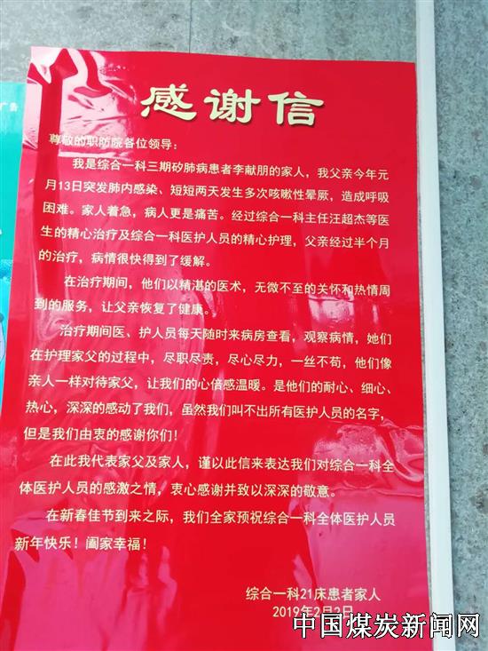 2月5日,春节刚过,在淮北矿业职业病防治院综合病区一楼,几位病人围在门口观看一副感谢信,笔者走进一看,原来是李献朋家人为感谢医务人员献上的感谢信。 ![]() 淮北矿业职业病防治院是为煤矿矽肺病患者治疗的二级专科医院,建院近四十年,秉承“诚信、关爱、优质”的办院宗旨,先后为矿区3000多名矽肺病患者提供治疗场所,使得淮北尘肺病患者生存年龄超过淮北市居民的平均年龄。职业病医疗部6个病区住院患者80岁以上就达几十人,90岁以上近十人,前几年曾为一位百岁尘肺病老人过生日,让患者家人感激不尽。 在近四十年的治疗服务中,该院想病人所想,急病人所急,不断提高医疗水平,完善医疗设备,先后开展大容量肺灌洗,职业健康检查,把预防和治疗相结合,使得尘肺病发病率逐渐下降,也为职工的身体健康保驾护航提供了有利条件,得到社会的广泛认可,在全省患者满意度测评中多次名列前茅。