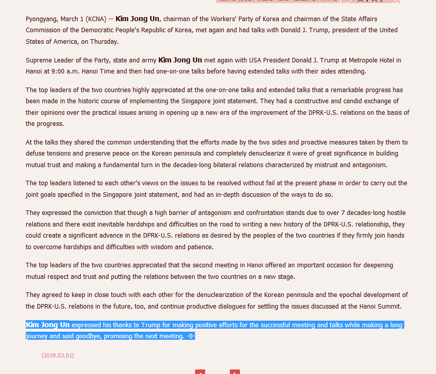朝中社报道截图。 【环球网报道 记者 赵建东】朝中社3月1日早消息,朝鲜领导人金正恩和美国总统特朗普承诺将再次举行会晤。朝中社还称,朝美河内峰会是加深两国互信和关系的“良机”。 当地时间3月1日凌晨0时15分左右,正在越南河内参加第二次朝美领导人会晤的朝鲜代表团深夜突然召集媒体记者举行发布会,就第二次朝美领导人会晤未能达成协议等会晤结果向媒体发布朝方立场。参与记者会的韩联社援引朝鲜外相李勇浩说法发出多条快讯,内容包括:朝方在金特会上并未要求彻底解除制裁,而是部分解除制裁;朝方向美国提出了非常现实的提议;朝方提出了永久停止核试验和远程导弹试验等。李勇浩说,美方在此基础上提出了一项新要求,但朝鲜无法予以满足。他还表示,即使美国寻求进一步谈判,平壤的态度也不会改变。 2月28日的越南首都河内,经历了“过山车”式的一天。就在当日早上,美国总统特朗普与朝鲜最高领导人金正恩共同出现在河内索菲特传奇大都会酒店时,所有人讨论的焦点还是“会有一份怎样的《河内宣言》”,包括对“无核化”和“正式结束朝鲜战争”等内容的期盼。然而到了中午,日程表上的工作午餐取消,签署联合协议的仪式也没了下文。 当天下午,特朗普的记者会比预报提前了两小时召开,尽管美国总统称两人会谈的气氛是友好的,“我们很喜欢彼此”“没有人拂袖而去”,但未能签署协议显然不是一个令人满意的结果。据CNN报道,在记者会上,特朗普表示,他和朝鲜最高领导人金正恩暂时没有第三次会谈的计划,“我们可以等着看看”。 版权作品,未经环球网 huanqiu.com 书面授权,严禁转载,违者将被追究法律责任。