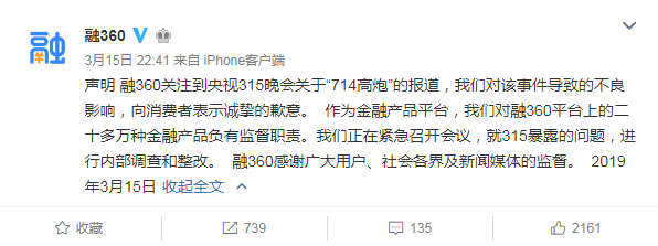 △2019年3·15追踪视频 刚刚“3·15”晚会曝光了河南、湖南两地辣条生产厂家卫生乱象。随后,记者和河南省开封市尉氏县市场监督局、公安局一行多人的联合执法队伍来到了生产辣条的尉氏县食品厂。针对3·15晚会上被曝光的生产车间“辣眼睛”的情况,尉氏县市场监督局副局长表示会要求对生产不卫生辣条的食品厂进行停业整顿。 “探针盒子”搜集个人信息!执法人员紧急出手:将对问题公司进行查处 △2019年3·15追踪视频 记者和执法人员赶往深圳市萨摩耶金融服务有限公司,对该公司进行检查。执法人员表示,将对有骚扰行为的公司进行查处,维护社会公平。 与此同时,另一路记者和执法人员赶到声牙科技有限公司,经执法人员初步了解,“探针盒子”通过识别MAC地址,发送一些针对用户的广告,初步了解这样的功能可以实现。 3·15晚会曝光网贷APP乱象,5人被带走调查! 3·15晚会曝光了“714高炮”网贷APP乱象,记者和执法人员前往相关企业现场,紫兰科技公司法人代表表示,他们的公司仅仅是一个科技公司,并没有从事相关的放贷行为。 对此,执法人员表示,目前已对现场进行查控,对相关的五名涉案人员带回公安部门进行调查,并对现场设备进行扣押,其中有部分数据可能涉及到个人隐私。下一步,执法人员将继续侦查,有情况将会通报。 “融360”被央视315点名,被App Store火速下架! 3·15晚会曝光“小额网贷乱象”,点名“融360”。融360自称是“中国领先的移动金融智选平台”,入驻着大量的小额贷款商户。3·15晚会刚刚播出,融360APP就被App Store火速下架! 融360回应称:“我们对该事件导致的不良影响,向消费者表示诚挚的歉意。作为金融产品平台,我们对融360平台上的二十多万种金融产品负有监督职责。我们正在紧急召开会议,就315暴露的问题,进行内部调查和整改。 融360感谢广大用户、社会各界及新闻媒体的监督。”