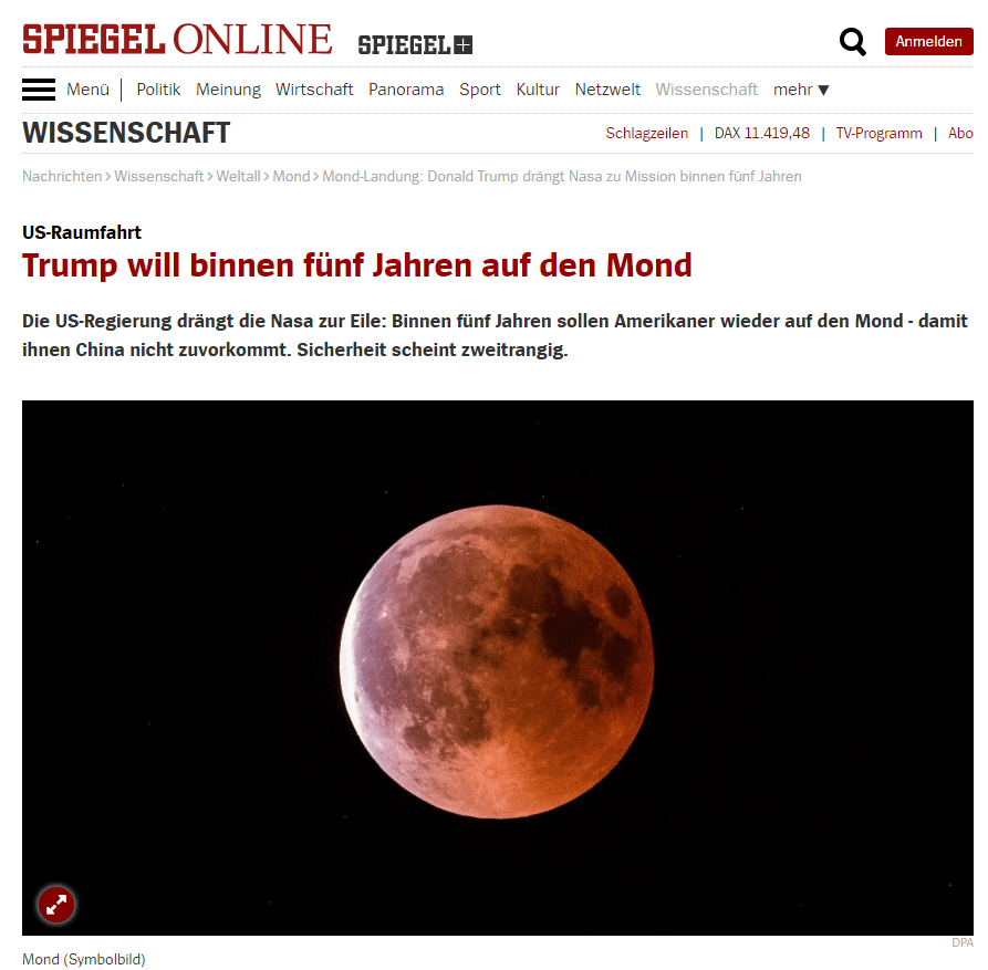 (《明镜》周刊:特朗普想在五年内登月)