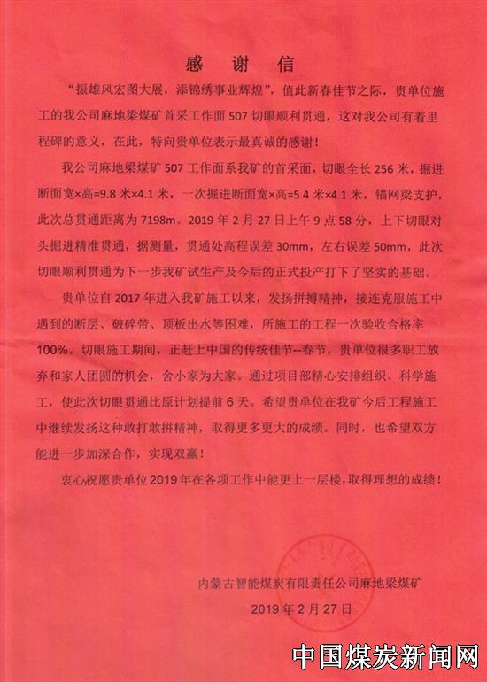 【本网讯】 2月27日,内蒙古智能煤炭有限责任公司麻地梁煤矿向中煤三建二十九工程处发来贺信,热烈祝贺该处麻地梁项目部施工的首采工作面507切眼顺利精准贯通。