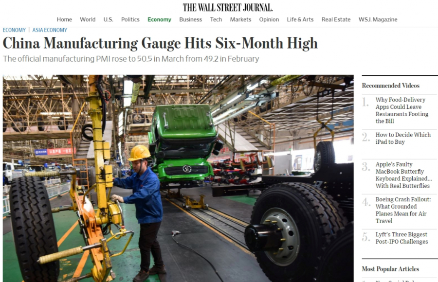美媒:中国3月份制造业PMI 创六个月新高