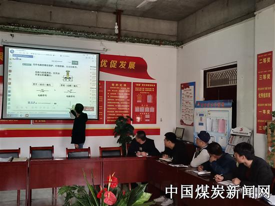 图为机电工程师、公司“劳模”李文贵正在针对继电器与接触器控制原理在澄合百良公司综合队每周业务培训课上为电气检修人员授课。