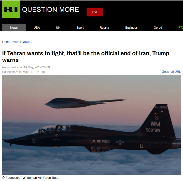 RT19日报道截图 伊朗外交部长贾瓦德•扎里夫18日在访问北京时对伊朗伊斯兰共和国通讯社(IRNA)表示:“不会发生战争,因为我们既不希望发生战争,也没有任何人认为可以在海湾地区与伊朗对抗。” 扎里夫早些时候就曾警告过美国外交政策中的“强硬派”。他将其称为“B组”(‘B Team’),其中就包括特朗普的国家安全顾问约翰•博尔顿。据《纽约时报》5月13日爆料,博尔顿要求政府官员和国防部拟定向中东派遣12万美军的计划,以对抗伊朗,此举在华盛顿引起轩然大波。随后特朗普14日在启程赴路易斯安那州前对记者说,美国目前没有类似计划,《纽约时报》的报道是“虚假新闻”。CNN上周曾说,特朗普并不希望对伊朗动武,而且对身边安全顾问总是撺掇与伊朗开战不满。 伊朗最高领袖哈梅内伊14日也保证,波斯湾不会发生战争。但他表示伊朗不会与美国就新的核协议进行谈判。 近些天来,美伊关系持续紧张。RT说,美国最近向伊朗施加的压力也越来越大,不仅对伊朗实施制裁,还在其领海附近加强军事建设。本周,美国及其盟友开始加强在波斯湾国际水域海上安全巡逻,此前美国还派遣“林肯”号航空母舰战斗群和B-52轰炸机特遣队前往中东地区。