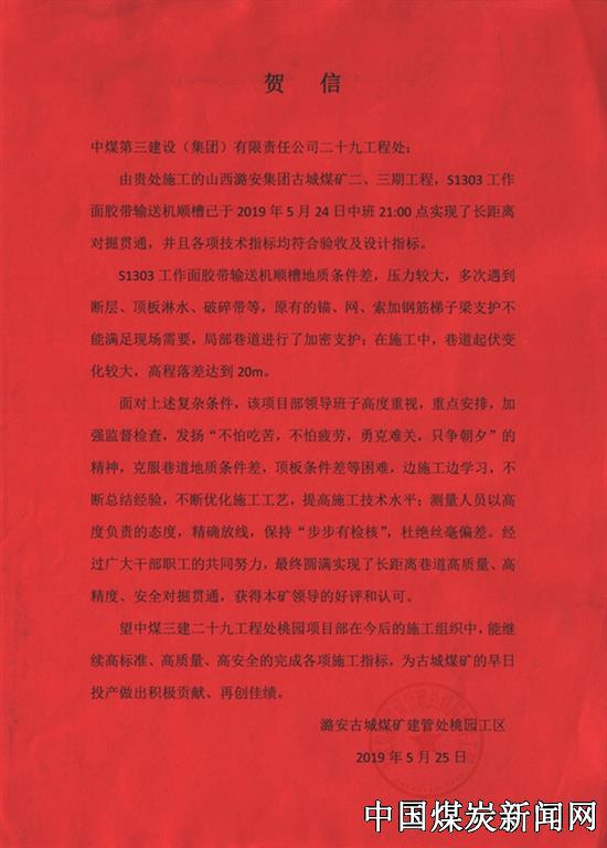 【本网讯】日前,潞安古城煤矿建管处桃园工区向中煤三建二十九工程处发来贺信,祝贺该处施工的山西潞安集团古城煤矿二、三期工程S1303工作面胶带输送机顺槽实现了长距离对掘贯通。