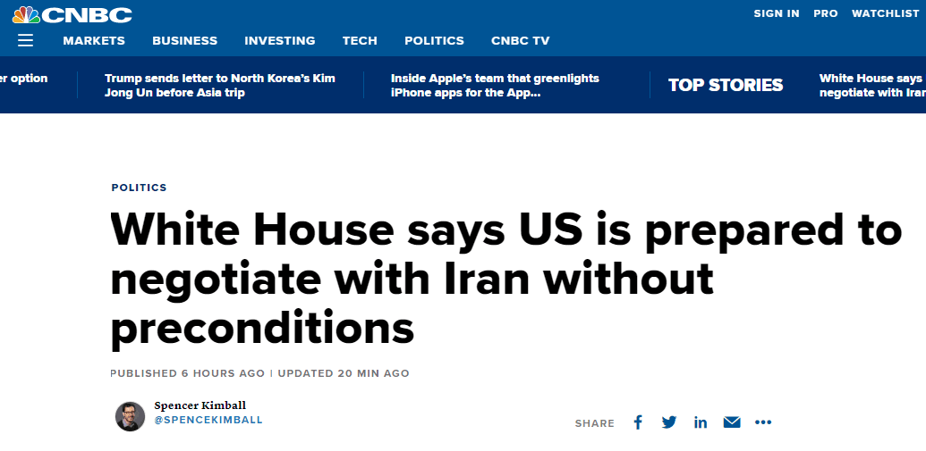 (CNBC报道截图) “我们准备在没有任何先决条件的情况下进行谈判,”蓬佩奥当天告诉记者,“我相信,在他们准备与我们接触的那一刻,我们将能够开始对话。” 蓬佩奥还表示,将前往沙特阿拉伯和阿联酋,以确保美国与其盟国“战略一致”。“我们将与他们讨论如何确保我们战略一致以及如何建立全球联盟。”他补充说。 在蓬佩奥如此表态前,美国总统特朗普在美国全国广播公司(NBC)“会见新闻界” 节目23日播出的采访中也作出了类似表态。特朗普表示,他“不想与伊朗开战”,而且愿意在没有先决条件的情况下与伊朗领导人谈判。 报道还提到,特朗普22日还宣布,美国将在周一(24日)对伊朗实施“重大额外制裁”。但伊朗却将这一威胁视为“只是宣传”。伊朗外交部发言人阿巴斯·穆萨维说:“所有制裁......已经实施了,不会再有制裁。” 此前,伊朗与美国之间正因前者击落美国无人机而处在“战争边缘”。多家美国媒体报道称,特朗普甚至已经下令军事打击伊朗,但随后撤回。特朗普说,他因认为被告知袭击会造成150人死亡,与伊朗击落无人机的伤亡“不对等”,而在军事打击发生前10分钟紧急叫停。