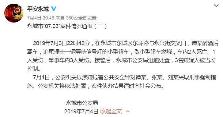 图片来源:央视新闻 22时42分,谭某某驾车行驶到东环路与永兴路交叉口时,与一辆等信号灯的宝马轿车追尾,宝马车被撞出数十米后瞬间起火燃烧。 永城市公安局交警大队事故科民警李朝亮在接受央视采访时曾表示,经检验鉴定,谭某某驾驶的这辆肇事车,事故发生的瞬间,车速是120到135之间。 最终,这起车辆追尾交通事故导致2人死亡、4人受伤。7月4日,公安机关以涉嫌危害公共安全罪,已对肇事车内3名嫌疑人采取刑事强制措施。