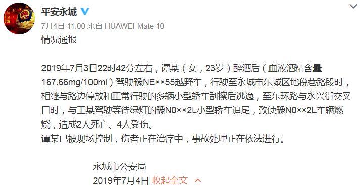警方通报。图片来源:@平安永城 ——代驾未到,是否可以成为醉驾的理由? 喝酒不开车,是每个驾驶人都知道的交通规范常识。但谭某某不但在开车前喝了酒,而且还喝了很多。 经警方检测,谭某某抽血化验,酒精含量是167.66,属于醉酒。而坐在宝马车上的三个人,事发当天晚上,经检测,没有喝酒。 据央视报道,据肇事车辆上的乘车人张某某称,三人先后饮用了1瓶红酒、2瓶日式清酒和数瓶啤酒。烧烤店内目击者也回忆:“喝的是啤酒,具体有多少当时没留意,看得出来三个人明显喝多了。” 此外,几人在事发前曾叫代驾,但代驾一直未到。张某某对媒体说:“我说叫个代驾吧,叫代驾后代驾一直没来,然后我们就坐车上等。”