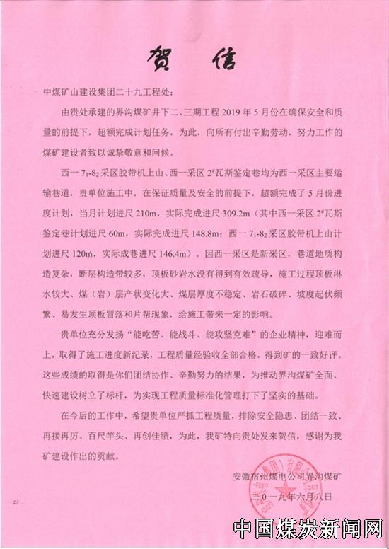 中煤三建二十九处界沟项目部超额完成任务赢贺信