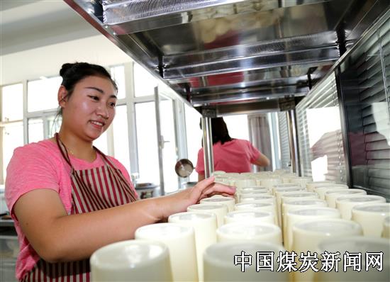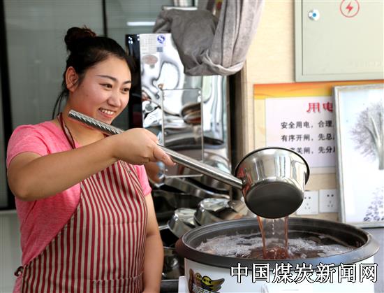 7月26日,同煤集团塔山煤矿女工协管员井口服务站正式启用,这标志着塔山煤矿为员工办好事办实事的又一力作,每天可以为出入井员工送上热气腾腾银耳汤、绿豆汤、姜汤等,使每一位出入井的员工感受到家一样的温暖。图为:服务站女工正在将热气腾腾绿豆汤送到员工手上。