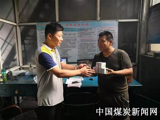 机电区工会结合单位工作实际,为奋战在一线选矸工段的职工发放了藿香正气水,预防职工发生中暑,为安全生产打下坚实基础。图为该区工会主席为职工发放藿香正气水。