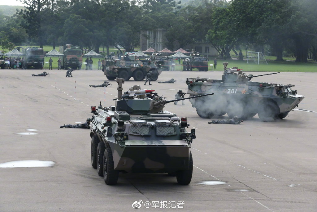 6月29日上午,驻香港部队举行2019年度军营开放活动。 而在此之前,驻港部队司令员陈道祥少将曾用“7个坚决”,表达驻军对维护国家主权安全和香港繁荣稳定的决心。中国官方媒体8月1日报道称,解放军驻香港部队于7月31日晚在香港中环军营举办庆祝中国人民解放军建军92周年招待会。会上,陈道祥少将表示,驻军将坚决听从党中央、中央军委和习主席指挥,坚决贯彻香港《基本法》《驻军法》,坚决支持林郑月娥行政长官带领特区政府依法施政,坚决支持香港警方严正执法,坚决支持特区政府有关部门和司法机构依法惩治暴力犯罪分子,坚决支持爱国爱港人士捍卫香港法治的行动,坚决维护国家主权安全和香港繁荣稳定,与社会各界携手开创香港更加美好的明天。 同一天,驻港部队还发布名为《不忘初心,守护香江》的超燃宣传片。该宣传片不仅让国人感到非常振奋,也引发众多外媒的关注与分析。“德国之声”的报道称,该宣传片强调,解放军“有信心”“有能力”维护香港的安全。报道称,3分钟左右的宣传片展示了坦克(片中无坦克出现,应为轮式步兵战车——编者注)、直升机、火箭弹等装备演练的镜头,还披露了全副武装的士兵进行反恐演习的画面。此外,驻港部队士兵进行乘坐装甲运兵车、使用水炮、手持盾牌以及步枪进行“防暴演练”的镜头也出现在宣传片中。报道称,片中还出现了士兵用广东话向演习中的示威者大喊“后果自负”的场景,并出示红旗警告示威者不要冲击。片尾则展示了驻港部队演练押送被捕示威者的画面,并点出了“不忘初心、守护香江”之主题。 报道认为,“中国军方口径明显变强硬”。该文章还称,香港前任特首梁振英7月29日在英国《金融时报》上撰文强调,驻港部队“不是装样子、搞仪式、形同虚设的”。 装备火力适当,机动性强 8月1日,中国外交部发言人华春莹强调,中方相信,解放军驻港部队将继续成为香港长期繁荣稳定的“定海神针”,那么这支“定海神针”部队到底有多强大呢? 香港驻军的确切人数究竟有多少,一直未正式公开。不过,美国《纽约时报》7月份的一篇报道称,外界估计驻港部队的人数在6000至1万之间。许多士兵部分时间住在与香港相邻的深圳,因为“那里的住宿更便宜,也更容易进行训练”。美媒的文章称,中国人民解放军管理着香港的19处军事用地,其中包括12个军营。最引人注目的几处包括直升机团所在的石岗机场、昂船洲的一个可停泊几艘小型军舰的海军基地,以及靠着维多利亚港的驻港部队大厦。 其中,昂船洲军营、石岗军营等都曾在开放日中向香港普通民众开放,展示了驻港部队的开放与自信。