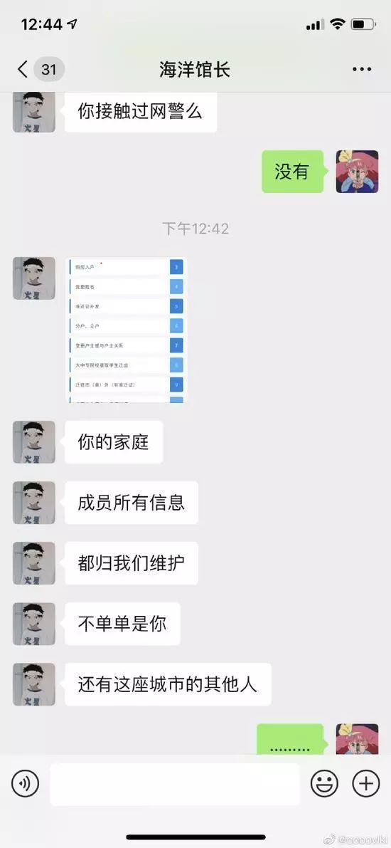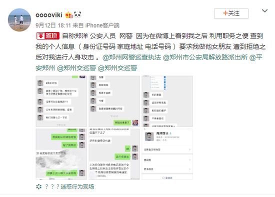 郑州警方:“已第一时间展开了调查,真相一定回水落石出,我们会及时通报情况”。 9月12日,微博网友@ooooviki 反映称,其个人信息疑遭“网警”查询,对方要求其做女友,遭拒后对她进行人身攻击。当晚,郑州市公安局官方微博@平安郑州 在该条微博底部评论称:“已第一时间展开了调查,真相一定回水落石出,我们会及时通报情况”。 @ooooviki 微博截图 @ooooviki 微博日常截图 12日下午,@ooooviki 发微博称,一名自称“郑洋”的公安网警,在微博上看到她资料后,利用职务之便,查询其身份证号码、家庭住址、电话号码等个人信息。 @ooooviki 称,对方要求她做他女朋友,遭到拒绝后对她进行人身攻击。 两张“海洋馆长”跟另一微信用户聊天的记录截图显示,这名用户疑似在向“海洋馆长”提供他人的身份证号码以及电话等信息,并提醒“你一定要保密,别让查到了兄弟,不然我在郑州单位混不下去了”。 @ooooviki 贴出的聊天记录截图