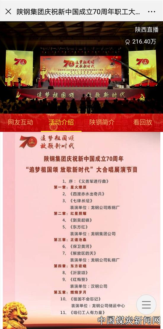 为庆祝新中国成立70周年,陕钢集团特举办了《追梦祖国颂,放歌新时代》大型歌唱展演活动。乐声有激昂有婉约有壮阔有华丽,用歌声赞颂祖国70年奋斗出的辉煌成就。热血沸腾之余,我去直播厅截了个屏,可以看到已经有216.4万人次的点击量,不觉振奋又自豪。