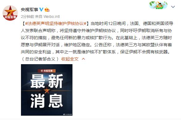 当地时间12日晚间,法国、德国和英国领导人发表联合声明称,将坚持遵守并维护伊朗核协议,同时呼吁伊朗取消所有与协议不符的措施,避免任何新的暴力或核扩散行为。在此基础上,法德英三方随时愿意与伊朗展开对话,维护地区稳定。公告还称,法德英三方与其欧盟伙伴有着共同的安全利益,其中之一就是维护核不扩散体系,保证伊朗不会拥有核武器。(总台记者邹合义)