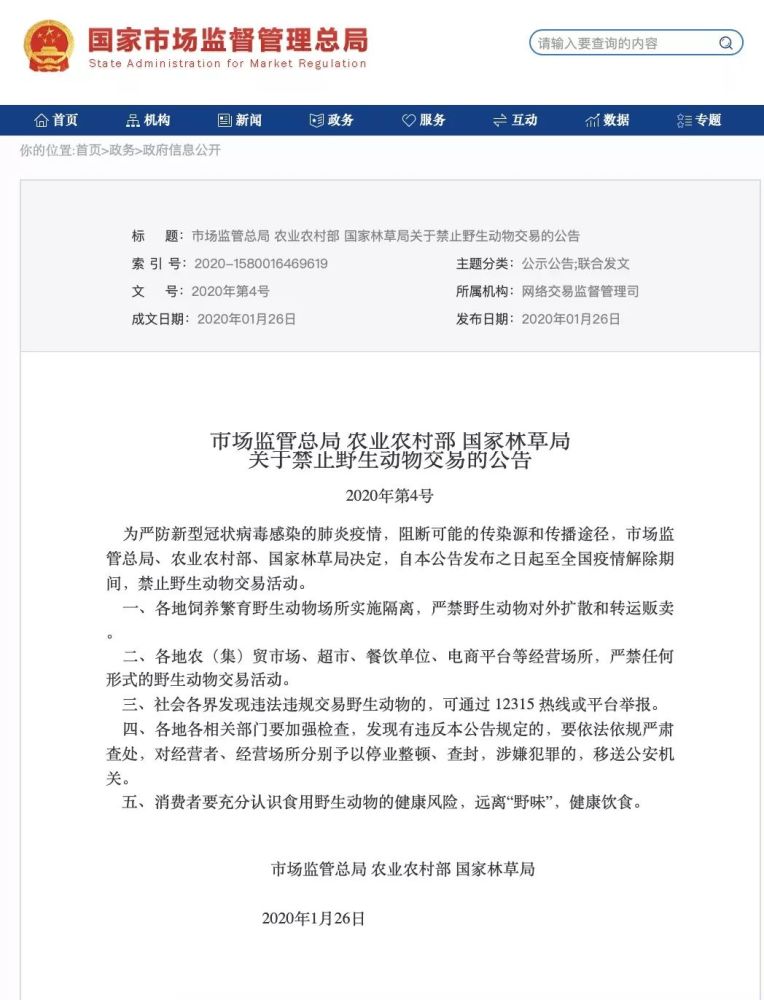 为严防新型冠状病毒感染的肺炎疫情,阻断可能的传染源和传播途径,市场监管总局、农业农村部、国家林草局决定,自本公告发布之日起至全国疫情解除期间,禁止野生动物交易活动。 一、各地饲养繁育野生动物场所实施隔离,严禁野生动物对外扩散和转运贩卖。 二、各地农(集)贸市场、超市、餐饮单位、电商平台等经营场所,严禁任何形式的野生动物交易活动。 三、社会各界发现违法违规交易野生动物的,可通过 12315 热线或平台举报。 四、各地各相关部门要加强检查,发现有违反本公告规定的,要依法依规严肃查处,对经营者、经营场所分别予以停业整顿、查封,涉嫌犯罪的,移送公安机关。 五、消费者要充分认识食用野生动物的健康风险,远离“野味”,健康饮食。 市场监管总局 农业农村部 国家林草局 2020年1月26日 来源:市场监管总局 农业农村部 国家林草局