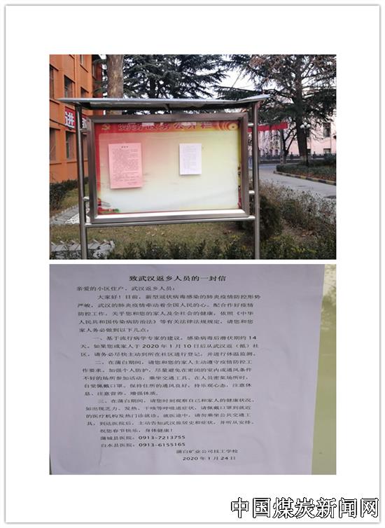 ![]() 多种渠道宣传,稳定思想阀门。《关于新型冠状病毒肺炎防控致学生、老师、家长的一封信》《致武汉返乡人员的一封信》《关于新型冠状病毒肺炎防控上广场封闭的温馨提示》,1月24日,蒲白矿业公司技校联合党委充分利用微信群、QQ群、LED滚动屏以及在醒目位置橱窗张贴通知等方式,加强全体干部职工、师生疫情防护知识宣传普及,增强防控意识,以保证全体干部职工、师生正确认识肺炎疫情。同时践行“做好自我生命安全防护”。并督促广大职工不信谣、不传谣、不造谣,相信科学,做到疫情防控人人知晓、人人参与,营造良好疫情防控攻坚战的浓厚舆论氛围。
