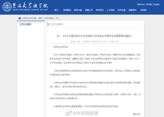 【吉林大学:研究生投稿须经导师同意,否则不得用于毕业与评奖】澎湃新闻从@吉林大学 法学院网站网站获悉,近日,吉大法学院转发了吉大研究生院文件《吉林大学关于加强对研究生在学期间公开发表论文等学术成果管理的通知》,受到广泛关注。