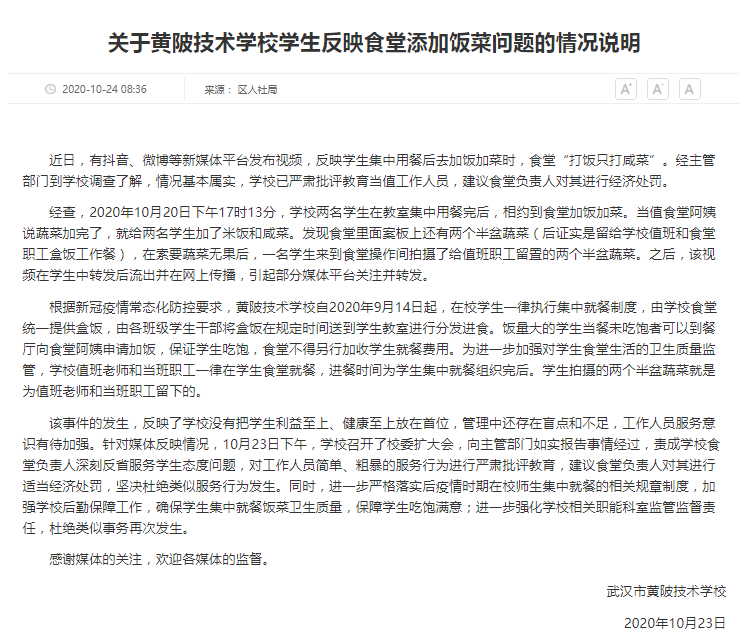 10月22日,武汉黄陂技术学校学生发视频称,有学生在二次加餐时,食堂藏起了热菜只给他们发咸菜。10月24日,武汉市黄陂区人民政府网站发布《关于黄陂技术学校学生反映食堂添加饭菜问题的情况说明》,经主管部门到学校调查了解,情况基本属实,学校已严肃批评教育当值工作人员,建议食堂负责人对其进行经济处罚。 据通报,近日,有抖音、微博等新媒体平台发布视频,反映学生集中用餐后去加饭加菜时,食堂“打饭只打咸菜”。经主管部门到学校调查了解,情况基本属实,学校已严肃批评教育当值工作人员,建议食堂负责人对其进行经济处罚。 经查,2020年10月20日下午17时13分,学校两名学生在教室集中用餐完后,相约到食堂加饭加菜。当值食堂阿姨说蔬菜加完了,就给两名学生加了米饭和咸菜。发现食堂里面案板上还有两个半盆蔬菜(后证实是留给学校值班和食堂职工盒饭工作餐),在索要蔬菜无果后,一名学生来到食堂操作间拍摄了给值班职工留置的两个半盆蔬菜。之后,该视频在学生中转发后流出并在网上传播,引起部分媒体平台关注并转发。 根据新冠疫情常态化防控要求,黄陂技术学校自2020年9月14日起,在校学生一律执行集中就餐制度,由学校食堂统一提供盒饭,由各班级学生干部将盒饭在规定时间送到学生教室进行分发进食。饭量大的学生当餐未吃饱者可以到餐厅向食堂阿姨申请加饭,保证学生吃饱,食堂不得另行加收学生就餐费用。为进一步加强对学生食堂生活的卫生质量监管,学校值班老师和当班职工一律在学生食堂就餐,进餐时间为学生集中就餐组织完后。学生拍摄的两个半盆蔬菜就是为值班老师和当班职工留下的。 通报称,该事件的发生,反映了学校没有把学生利益至上、健康至上放在首位,管理中还存在盲点和不足,工作人员服务意识有待加强。针对媒体反映情况,10月23日下午,学校召开了校委扩大会,向主管部门如实报告事情经过,责成学校食堂负责人深刻反省服务学生态度问题,对工作人员简单、粗暴的服务行为进行严肃批评教育,建议食堂负责人对其进行适当经济处罚,坚决杜绝类似服务行为发生。同时,进一步严格落实后疫情时期在校师生集中就餐的相关规章制度,加强学校后勤保障工作,确保学生集中就餐饭菜卫生质量,保障学生吃饱满意;进一步强化学校相关职能科室监管监督责任,杜绝类似事务再次发生。