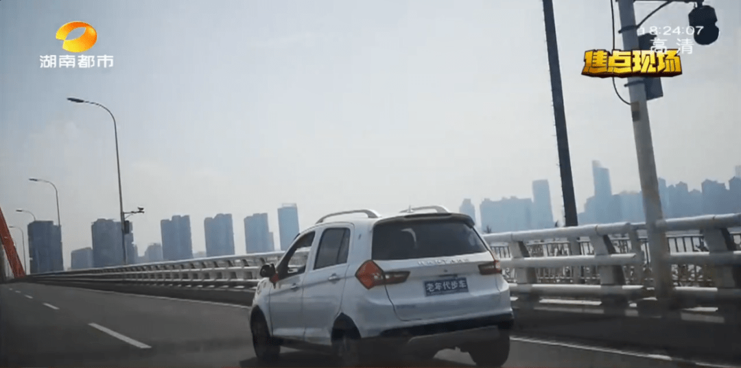 这是市民在长沙潇湘大道附近拍摄下的画面,这台四轮小车没有挂牌照,牌照的位置只有一个老年代步车的标牌,从潇湘大道这台车从匝道转弯上了福元路大桥,随后开始加速。市民将车速提升至60公里才勉强追上了这台车。 望城区交警大队民警表示,这种老年代步车车身较轻中心较高,发生事故极易发生翻滚。在长沙金星大道,交警监控就记录了一起老年代步车的交通事故。