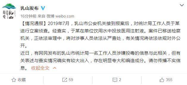 微博截图 近日,有网民发布的乳山市统计局一名工作人员涉嫌投毒的信息与此相关,但有关表述与查实情况确实有较大出入,存在明显夸大和编造成分。请勿传播不实信息。