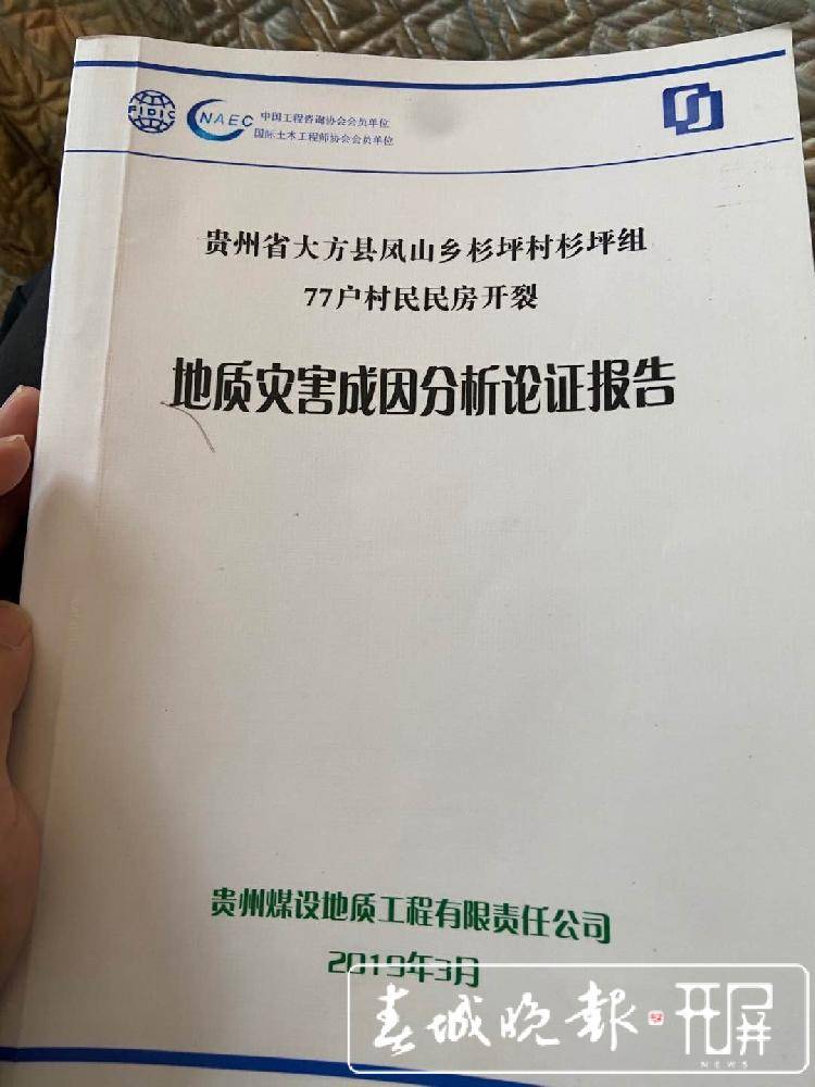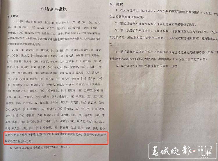 其中,陈代军等16户居民的房屋出现开裂、瓦屋瓦块下移、滑落,是由于渣坪煤矿新系统井巷掘进爆破作业活动造成。60余户人家的房屋开裂是由于基础深埋、建筑设计与施工、温度差异、降雨等原因综合造成的。 值得注意的是,在渣坪煤矿开采前,杉坪村就有约60年的煤矿开采历史。陈代军、曾凡友等村民也并不否认,村庄房屋下方曾是小煤窑的采空区。不少村民在上世纪八九十年代,都曾在小煤窑里挖过煤。直至2000年前后,随着当地政府加大整治小煤窑的力度,才结束了私挖乱采的局面。但村民强调,渣坪煤矿新建的三口井,正是位于昔日采空区的下方。 大方县能源局、凤山乡政府等部门认为,第三方机构通过开展野外调査、测量测绘及勘查工作,对受损居民房屋的开裂情况及地表变形情况进行逐一调查,对渣坪煤矿采掘工程活动井下爆破及采空区塌陷等影响范围进行了勘察及综合分析,得出的鉴定结论具有科学性、权威性,对处理这一矛盾纠纷有了可靠依据。 2019年3月,经煤矿矿长、煤矿上级公司负责人、验收组组长、县工信局分管领导、县政府主要负责人等8人签字确认后,渣坪煤矿得以复工复产。大方县能源局陈副局长在接受开屏新闻记者采访时表示:群众利益无小事,省级部门在接到群众反映后,曾要求煤矿停工以配合调查。但煤矿也是合法企业,在调查结束有了鉴定结论后,应当允许企业进行正常的生产经营活动。 有了鉴定结论后,当地政府也组织村民与煤矿商谈赔偿事宜,但双方却根本谈不拢。一方面,煤矿依据鉴定结论认为自己只应对16户村民房屋损坏的问题负责。另一方面,77户村民认为,房屋开裂与煤矿爆破有必然关系,并不认可鉴定结论;此外,煤矿对村民的赔偿金额过低。 在赔偿没谈拢的情况下煤矿得以复工复产,村民们也做出过集体堵路、阻挠企业生产等不理智行为。 谈不拢的僵局 矛盾纠纷僵持不下,大方县相关部门再次组织第三方机构对房屋开裂变形成因进行鉴定。值得注意的是,第二次的鉴定结论与第一次鉴定的结论趋同。 贵州警察学院司法鉴定中心于2019年10月12日,出具第二份司法鉴定意见,与第一份司法鉴定相比,第二份鉴定意见中,爆破对建筑物影响区域的半径范围略有缩减。 今年6月,贵州省地矿局第二工程勘察院出具了《大方县凤山乡杉坪村杉坪组崔维兴等居民房屋开裂变形成因分析论证报告》。该院对杉坪村小组95栋房屋进行调查,结论为,16栋房屋位于煤矿巷道掘进爆破振动影响范围内,其开裂变形与渣坪煤矿巷道掘进爆破振动有关。其余79栋居民房屋位于渣坪煤矿采空区塌陷和爆破影响范围之外,其开裂变形与渣坪煤矿采煤工程活动无关。