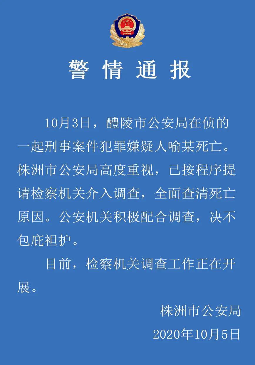 湖南醴陵一在侦刑案犯罪嫌疑人死亡,检方已开展调查