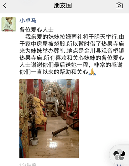 昨天(5日),被前夫泼汽油烧伤不治身亡的四川阿坝金川县“网红”拉姆的葬礼在当地的一处寺庙举行,拉姆的亲戚朋友、许多当地人和粉丝前来送她最后一程。拉姆的姐姐卓玛告诉南都记者,安葬妹妹后,还会继续为她念经,对于今后她不敢想, “最大的问题就是怎么解决父亲住的问题,现在房子都被炸毁了,父亲没有地方去,还怕那家人(拉姆前夫一家)再找来,想请求政府给爸爸找个安全一点的地方住。”