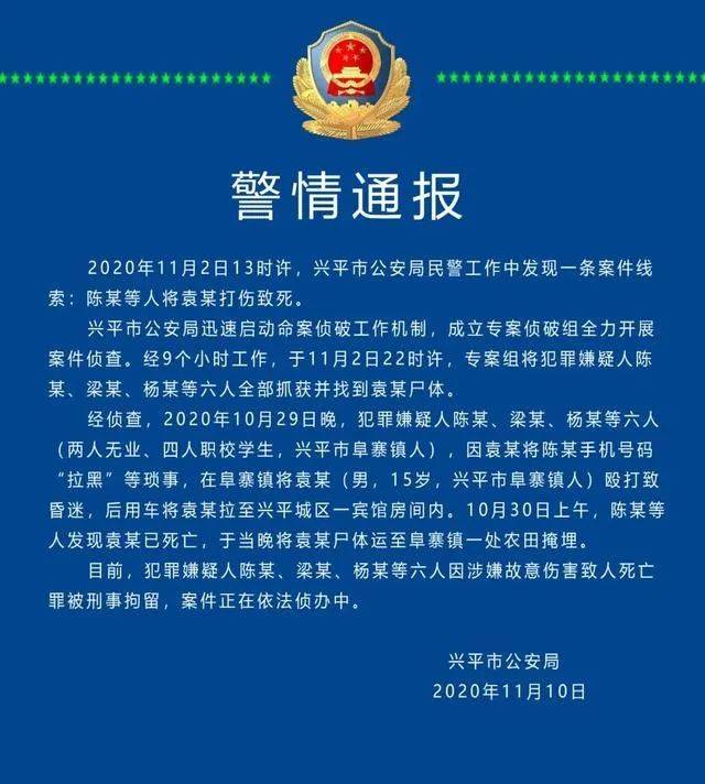 (袁某被掩埋处,受访者供图) 纵相新闻:您对这件事目前还有哪些诉求? 受害者父亲:现在家里还有他妈妈和爷爷奶奶,一家人都承受不了这个打击。 我还是一句话,这些孩子不能流入到社会,他们一旦流入社会,会对社会造成多大影响。我相信法律是公平公正的,希望公安人员能秉公执法,法庭能够严判重判。 案情进展 11月10日,兴平公安发布关于此事的通报,称于11月2日22时许,专案组将犯罪嫌疑人陈某、梁某、杨某等六人全部抓获并找到袁某尸体。 通报显示,经侦查,2020年10月29日晚,犯罪嫌疑人陈某、梁某、杨某等六人(两人无业、四人职校学生,兴平市阜寨镇人),因袁某将陈某手机号码“拉黑”等琐事,在阜寨镇将袁某(男,15岁,兴平市阜寨镇人)殴打致昏迷,后用车将袁某拉至兴平城区一宾馆房间内。10月30日上午,陈某等人发现袁某已死亡,于当晩将袁某尸体运至阜寨镇一处农田掩埋。 目前,犯罪嫌疑人陈某、梁某、杨某等六人因涉嫌故意伤害致人死亡罪被刑事拘留,案件正在依法侦办中。