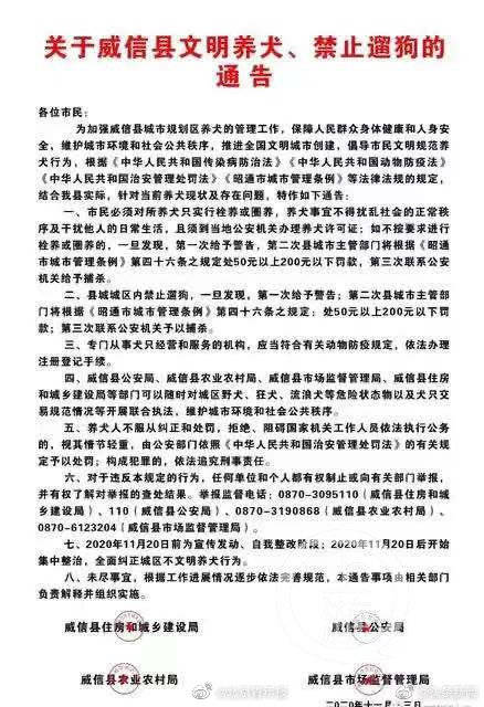 【云南威信回应“禁止遛狗第3次直接捕杀”:正在研究相关情况】云南威信回应养犬新规11月13日,云南昭通市威信县公安局、住建局、农业农村局和市场监督管理局等4部门联合发布《关于威信县文明养犬、禁止遛狗的通告》,规定市民必须对所养犬只实行栓养或圈养,此外,县城城区内禁止遛狗,一旦发现,第一次给予警告;第二次县城市主管部门将根据《昭通市城市管理条例》第四十六条之规定,处50元以上200元以下罚款;第三次联系公安机关予以捕杀。”11月15日,威信县主要领导就此新规回应称,威信县对于犬只管理规定引发的舆情非常重视,正在召集多部门研究此事,“城市管理要规范,但任何事都要依法依规。”(上游新闻)