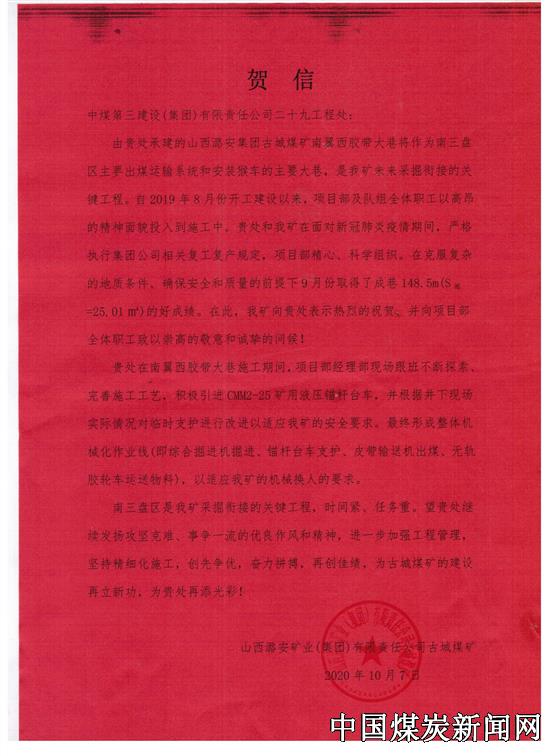 【本网讯】日前,山西潞安矿业(集团)有限责任公司古城煤矿向中煤三建二十九工程处发来贺信,热烈祝贺该处承建的山西潞安集团古城煤矿南翼西胶带大巷,在克服复杂的地质条件、确保安全和质量的前提下取得了月度成巷148.5m(S掘=25.01m²)的好成绩。