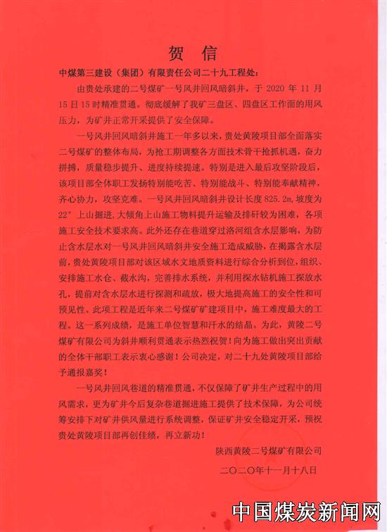 【本网讯】近日,陕西黄陵二号煤矿有限公司向中煤三建二十九工程处发来贺信,祝贺该处承建的二号煤矿一号风井回风暗斜井于2020年11月15日15时实现精准贯通。