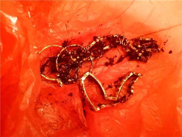 (从康菲菲坟墓中挖出的“三金”) 郝桂花随即找到“三金”给记者看。记者在一个红色塑料袋里看到,里面装有两个金耳环、一条金项链和一个金手镯,它们的颜色已经变得黯淡无光,其中还夹杂着一些毛发。 怕“打仗”,才选择半夜12点多去取尸骨 说起为何在女儿去世12年后才取走她的尸骨,郝桂花说,几个月前,她和丈夫康新正生气伤了心,就想去女儿的坟前哭一场。但到了女儿的坟前,却发现李家的祖坟已经迁走了,唯独把女儿的坟墓留在了原处。她认为李家把她女儿给扔了,她心疼小丫头,就想把小丫头的尸骨取回来给她找个好归宿。此外,小丫头死了之后,李家便跟他们断了关系,既然早就断了亲戚关系,更没有把女儿尸骨留在这里的道理。 郝桂花说,发现女儿被扔下不管后,她曾经打电话质问李卫军起坟为何不告诉她,还问为何把她闺女给扔下了,但李卫军解释说没扔下,之所以没迁康菲菲的坟是因为她是孤坟,不能进祖坟。当她表达了想把闺女尸骨取回去的想法时,李卫军骂她“吹牛”,两人没有商谈成。随后,她又托时任派出所所长代为商量迁葬康菲菲尸骨的事儿,但所长回话说没说成。 不得已,她便到黄骅市“请示”了三位律师,问迁走姑娘的尸骨犯不犯法,三位律师都回答说不犯法,他们又告诉她迁坟虽然不犯法,但迁坟时如果“打仗”伤了人那就犯法了。为了避免“打仗”,她们才选择了深夜去取女儿的尸骨。